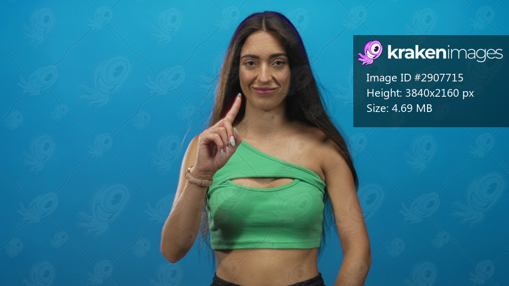 Young hispanic woman finger pointing up while adjusting green crop top in blue studio; confidence empowerment.