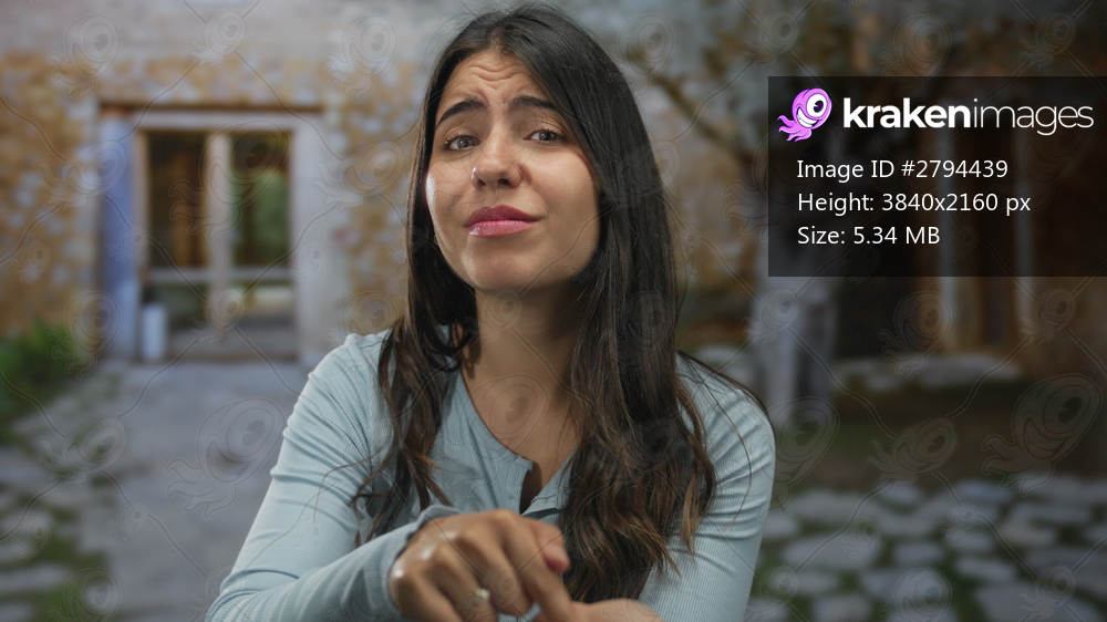 Young hispanic woman finger tapping her palm outdoors by aged stone building pressing for cash gesture; desperation.