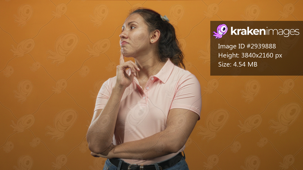 Young hispanic woman with finger to chin in orange studio wearing pink polo and jeans, hair tied back and slight smile; thoughtful pondering.