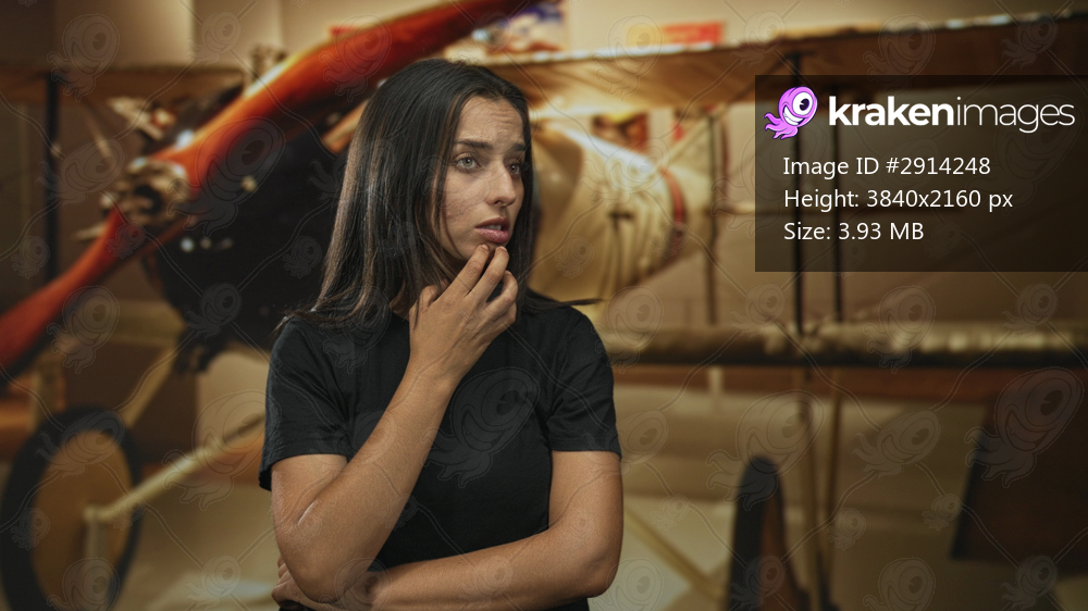 Young hispanic woman, finger to lips beside a vintage biplane in a museum building with exhibit lighting and aircraft propeller visible; contemplation. - Kraken Images