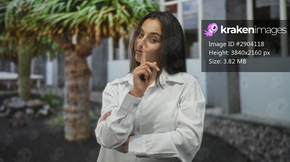 Young hispanic woman with finger to lips for silence in a building courtyard, crossed arms and white shirt; confidence.