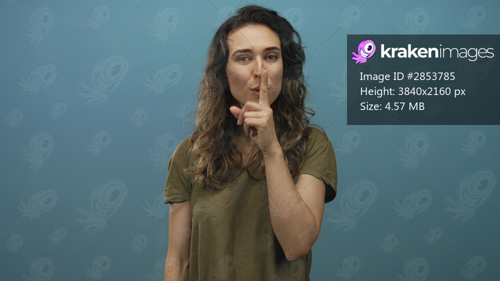 Young hispanic woman finger to lips for silence in blue studio setting with green shirt visible; hush.