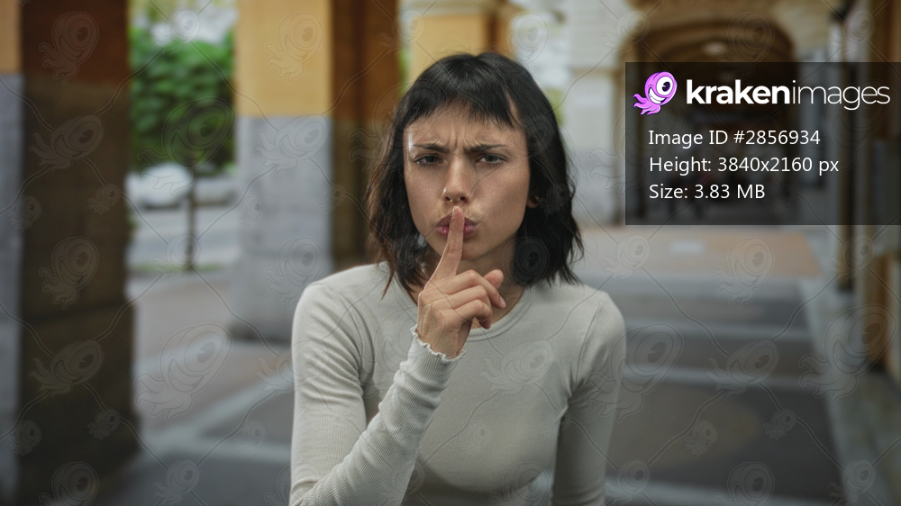 Young hispanic woman finger to lips for silence while standing on sunlit street colonnade beneath historic building arches; secrecy.