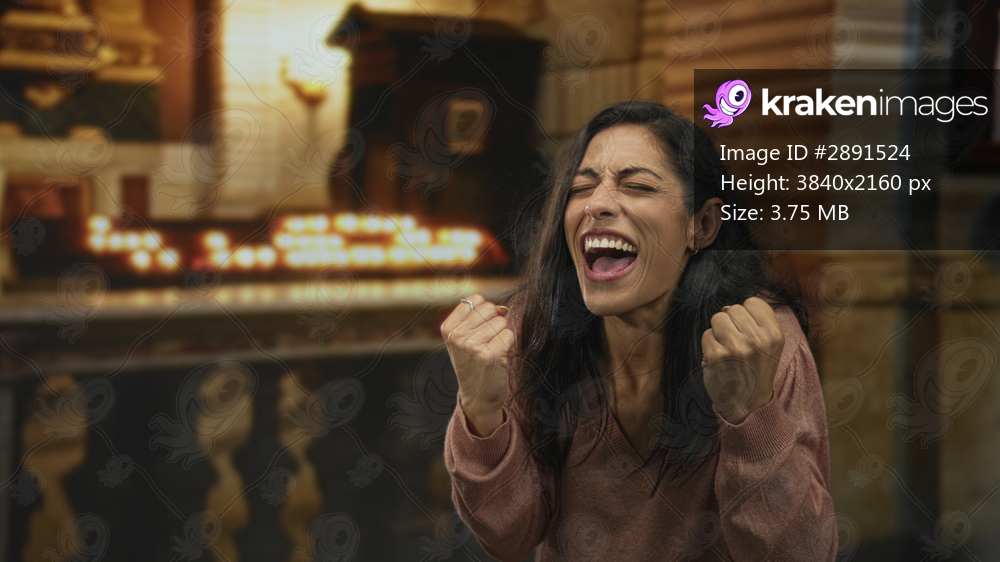 Young hispanic woman with fists clenched shouting in church near votive candles and stone altar; faith joy devotion.