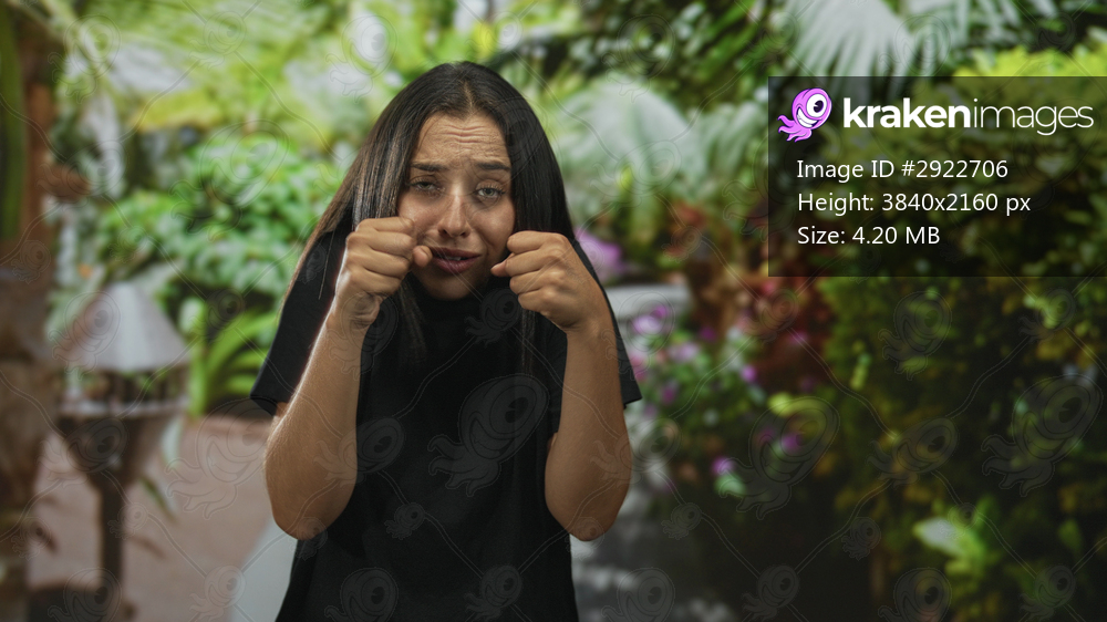 Young hispanic woman with fists pressed to face and visible hands in park with green foliage and a walkway; tired reflection.