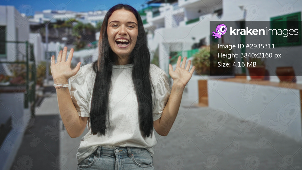Young hispanic woman with fists raised smiling and laughing on a whitewashed street; joy celebration.