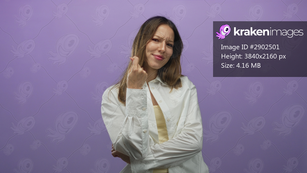 Young hispanic woman flashing peace sign and smiling in studio with purple backdrop, wearing white shirt and crop top; playful confidence.