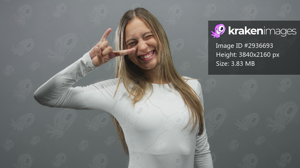 Young hispanic woman flashing rock horns hand gesture in gray studio wearing a white long sleeve top; joyful celebration.