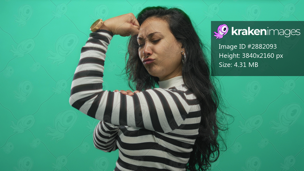 Young hispanic woman flexes arm with fist to forehead in green studio wearing black and white striped top; confidence strength joy.