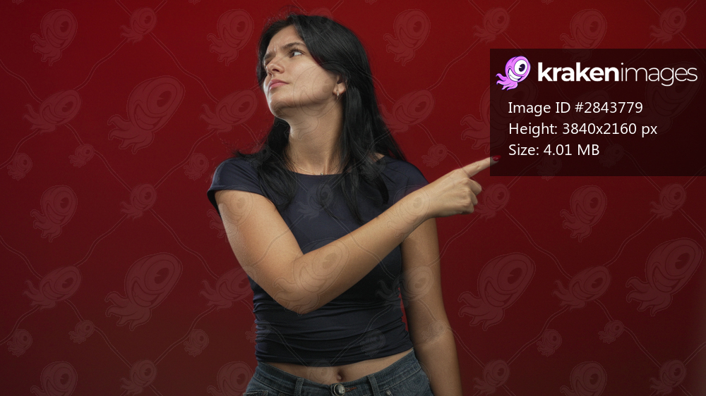 Young hispanic woman flicks finger dismissively in red studio with skeptical expression; defiance rejection.