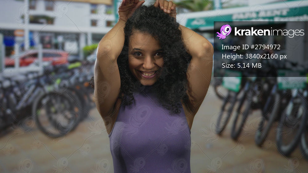 Young hispanic woman forming ear gesture with hands near bike parking outside building; playfulness.