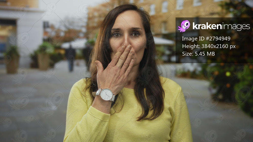 Young hispanic woman forming lips to blow a kiss to camera on street; affection playfulness greeting.