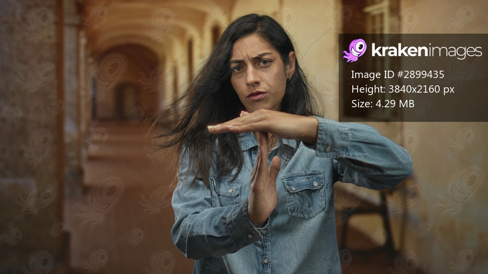 Young hispanic woman forming timeout gesture with hands in old town building corridor wearing denim shirt; determination.