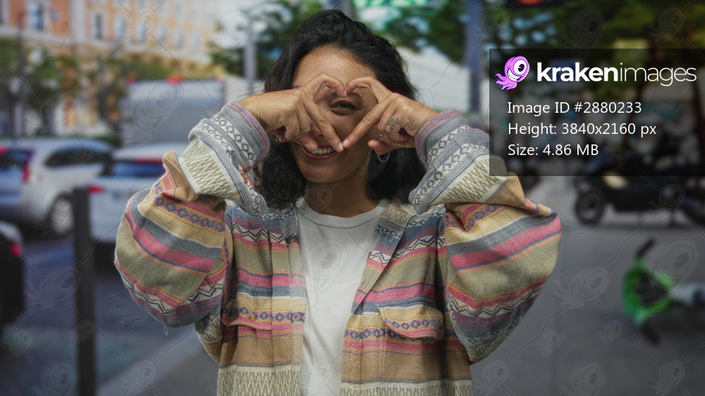 Young hispanic woman forms heart with hands on busy city street while smiling at camera; joy love friendship.