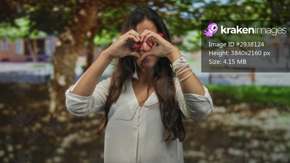 Young hispanic woman forms heart with hands and smiles wearing pink glasses and white blouse in park under trees with bench and greenery visible; joy.