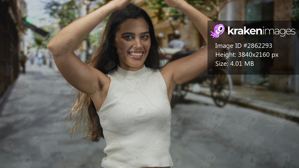 Young hispanic woman forms heart with raised arms on a busy city street with horse carriage; joy love connection.