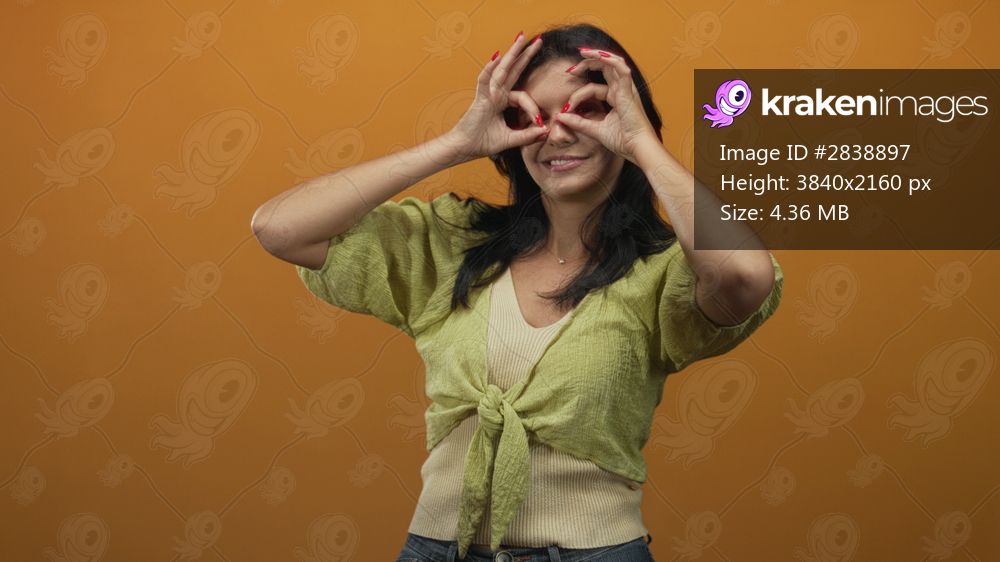 Young hispanic woman frames eyes with fingers in binocular gesture in orange studio; curiosity playfulness.