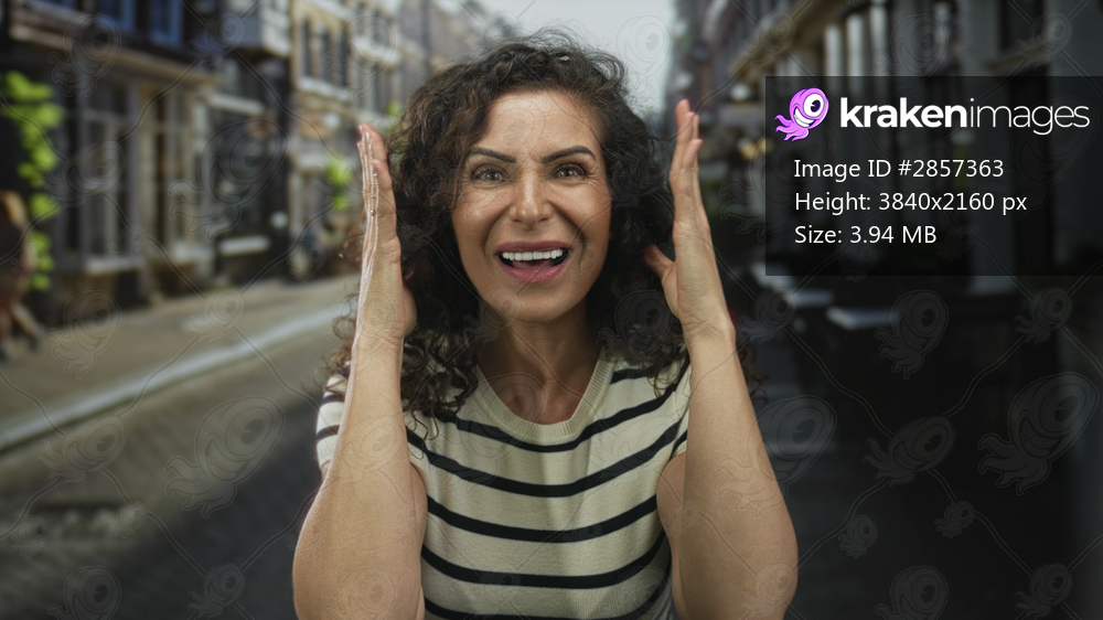 Young hispanic woman frames face with hands on street with raised eyebrows and pursed lips; confusion introspection.