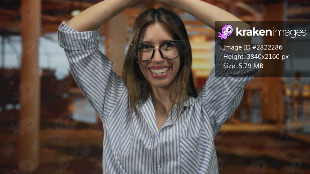 Young hispanic woman frames face with raised arms under warm ambient hotel lobby lighting in spacious interior; joy.