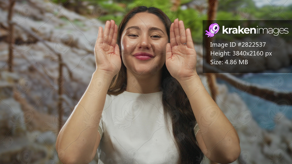 Young hispanic woman frames her smiling face with cupped hands while looking toward camera on a rocky seaside beach; happiness joy.