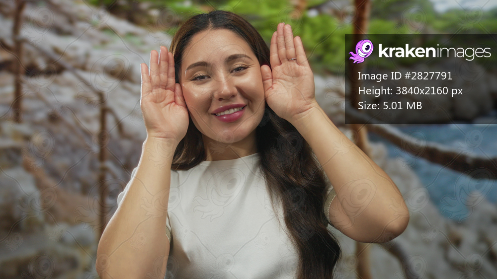 Young hispanic woman frames her smiling face with cupped hands while looking toward camera on a rocky seaside beach; happiness joy.