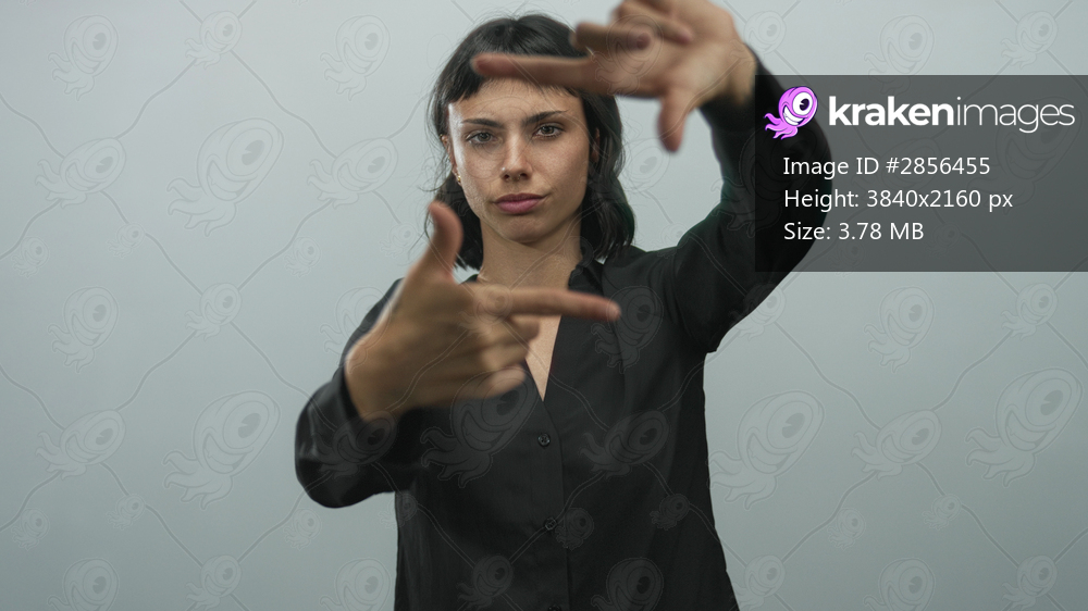 Young hispanic woman framing scene with hands against gray studio wall with focused gaze and poised fingers; concentration creativity.