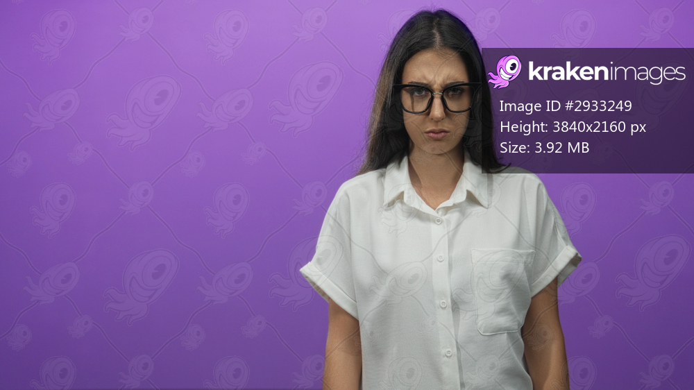 Young hispanic woman frowning with furrowed brow and pursed lips wearing white shirt in purple studio backdrop; frustration.