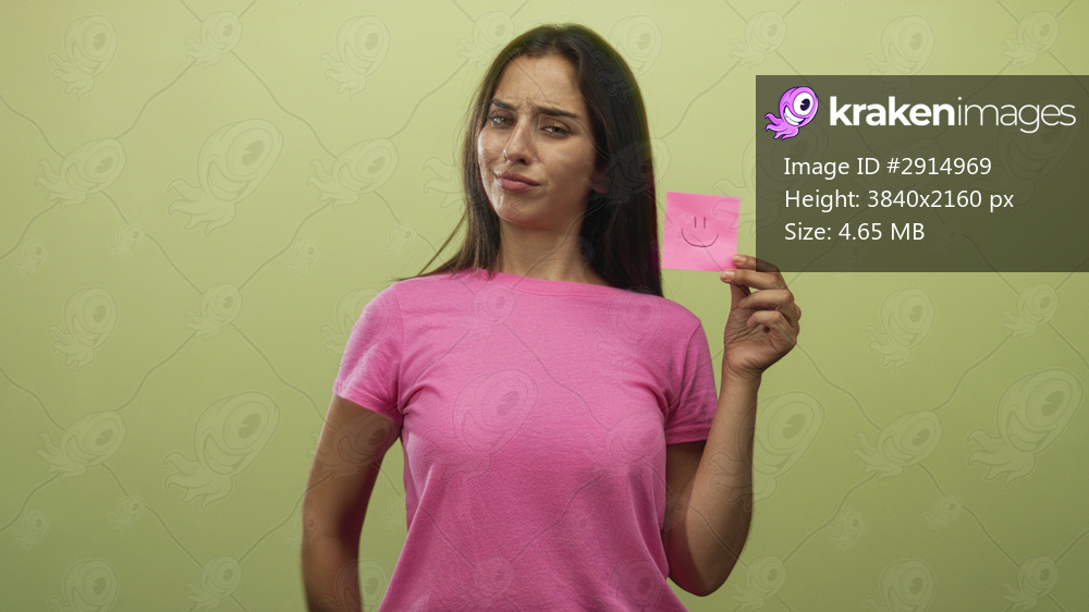 Young hispanic woman frowning while holding pink sticky note with smiley in studio with pale green wall; discomfort.