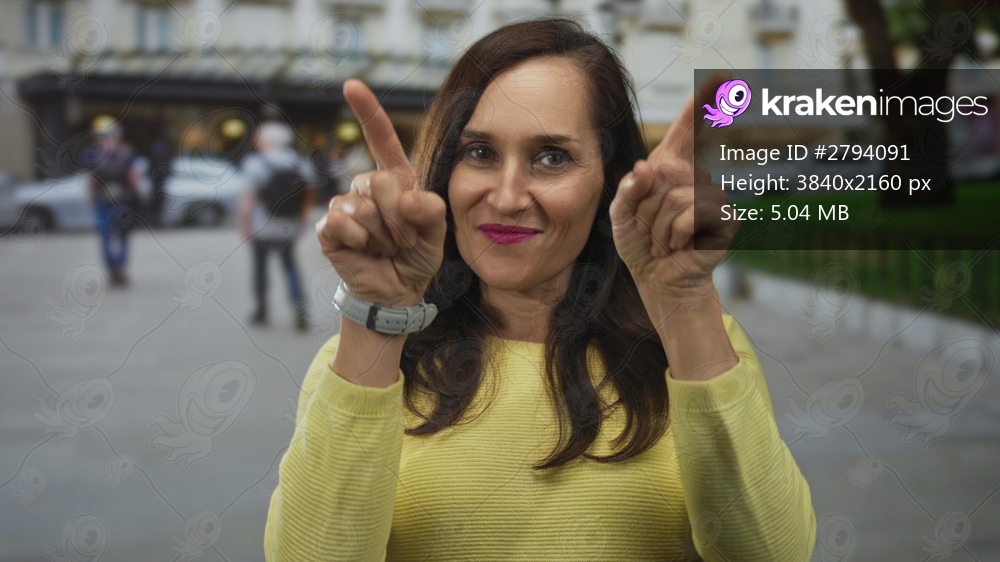 Young hispanic woman gently kisses air with lips on busy city street; affection playfulness flirtation.