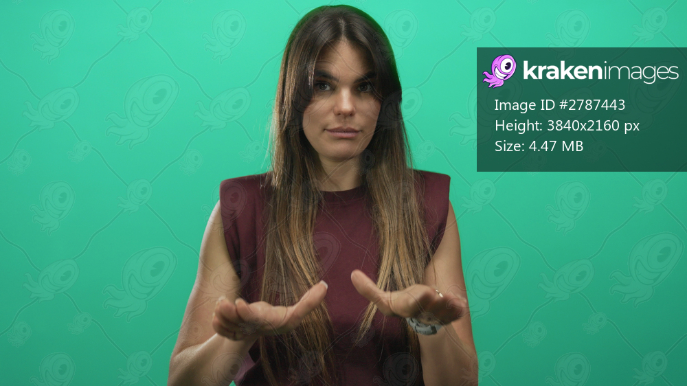 Young hispanic woman gestures calmly against a green background wall, wearing casual attire and displaying serene body language, emphasizing tranquility and peace. - Kraken Images