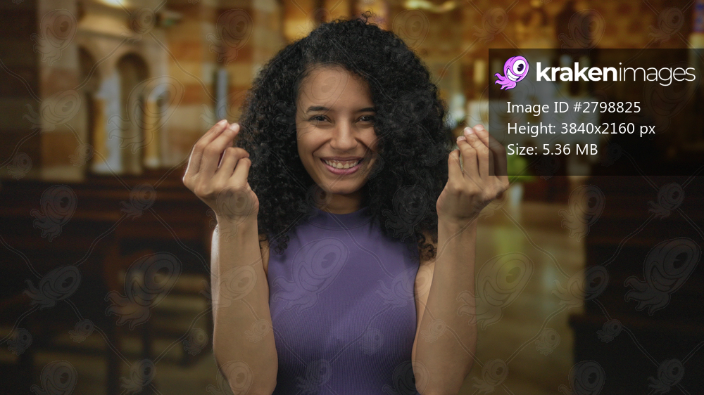 Young hispanic woman gestures counting banknotes in historic church building; financial playfulness.