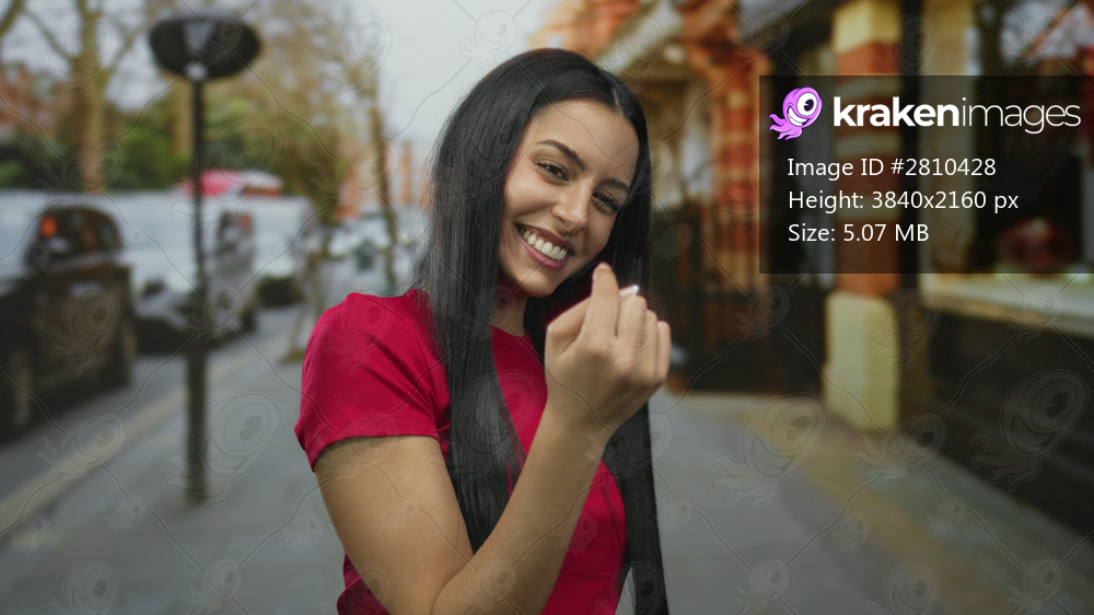 Young hispanic woman gestures outdoors on urban street invitingly, surrounded by cars and city buildings, creating a lively cityscape scene full of movement and interaction. - Kraken Images