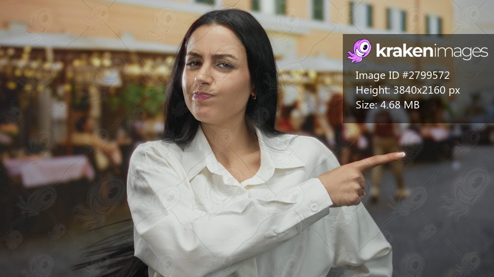 Young hispanic woman gestures outside a bustling restaurant terrace, wearing a white shirt and expressing disagreement.
