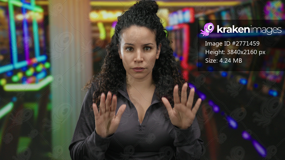 Young hispanic woman gesturing calmly in a vibrant casino setting with colorful slot machines in the background, conveying a sense of tranquility amidst the excitement. - Kraken Images