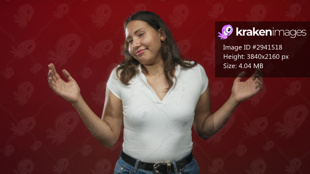 Young hispanic woman gesturing with open hands and visible arms in studio against red backdrop, wearing white shirt and jeans; uncertainty.