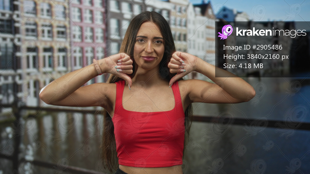 Young hispanic woman gives thumbs down gesture on amsterdam street canal bridge; disapproval critique.