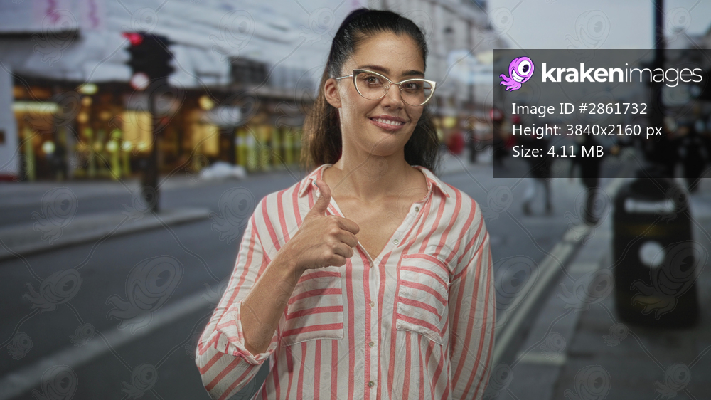 Young hispanic woman giving thumbs up in busy city street wearing striped blouse and glasses; optimism.