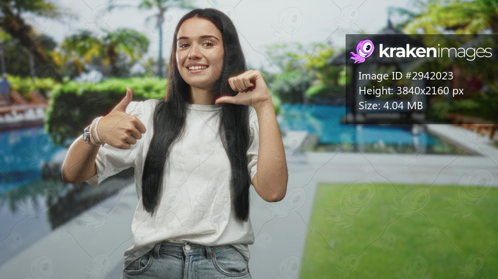Young hispanic woman giving thumbs up with left thumb and thumb to chest by a pool beside a building, wearing white tshirt and jeans; confidence.