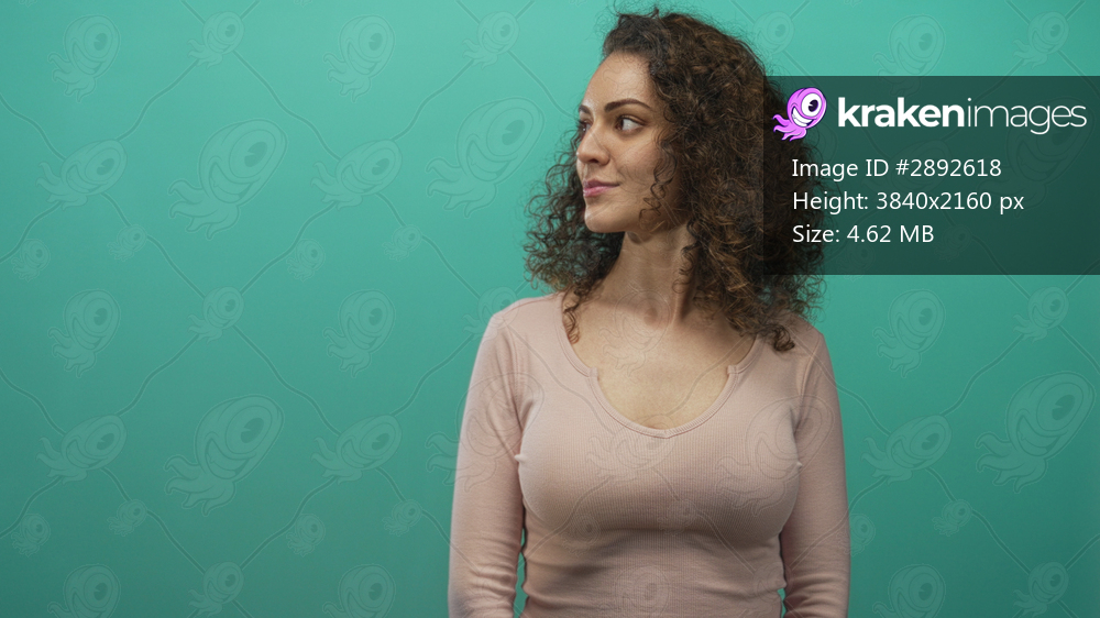 Young hispanic woman glancing to the right showing exposed neck and curly hair against a teal studio wall; calm confidence.