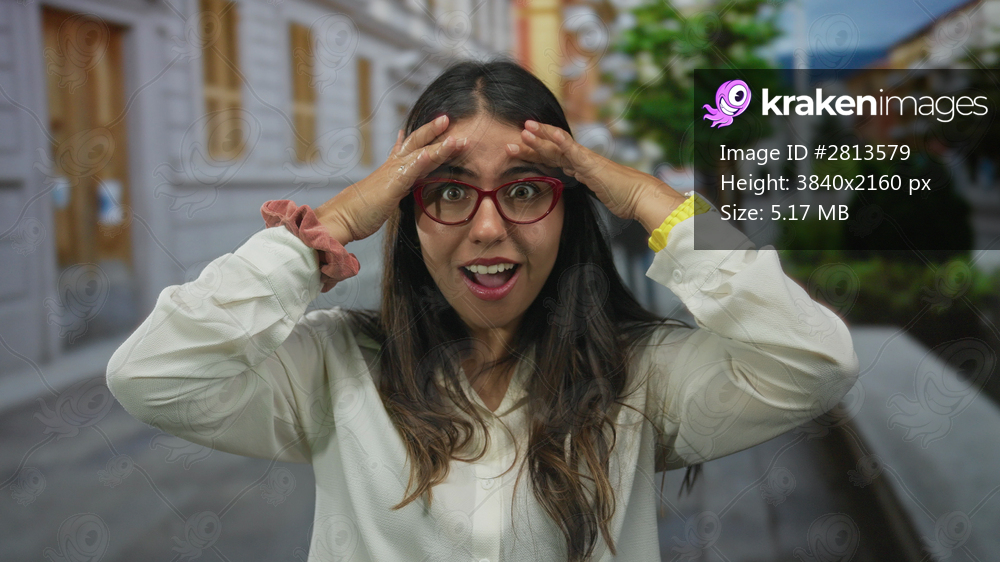 Young hispanic woman with glasses expressing surprise outdoors on a street lined with trees and urban buildings illuminated by daylight