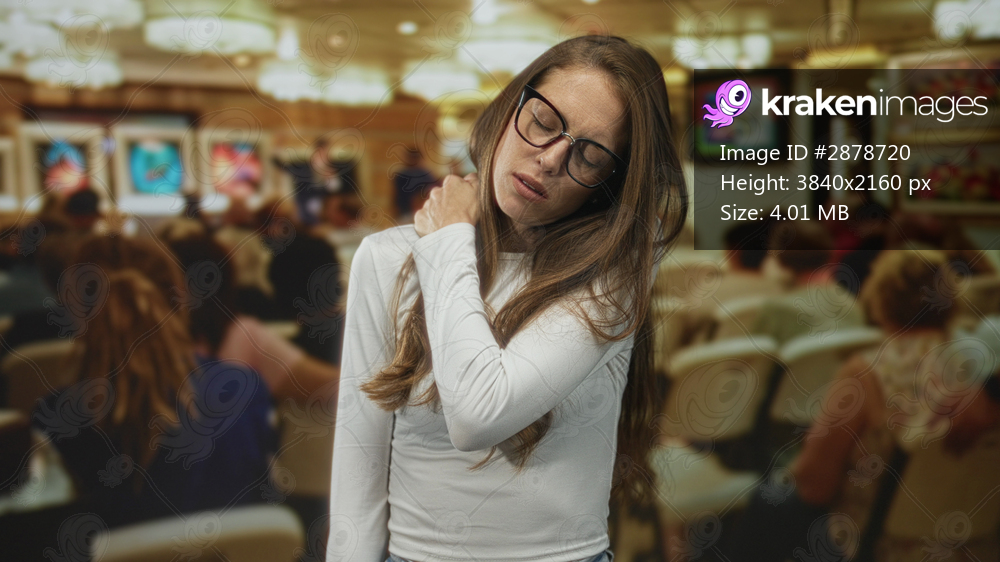 Young hispanic woman with glasses holding her shoulder while wincing in an art gallery among seated visitors; discomfort.