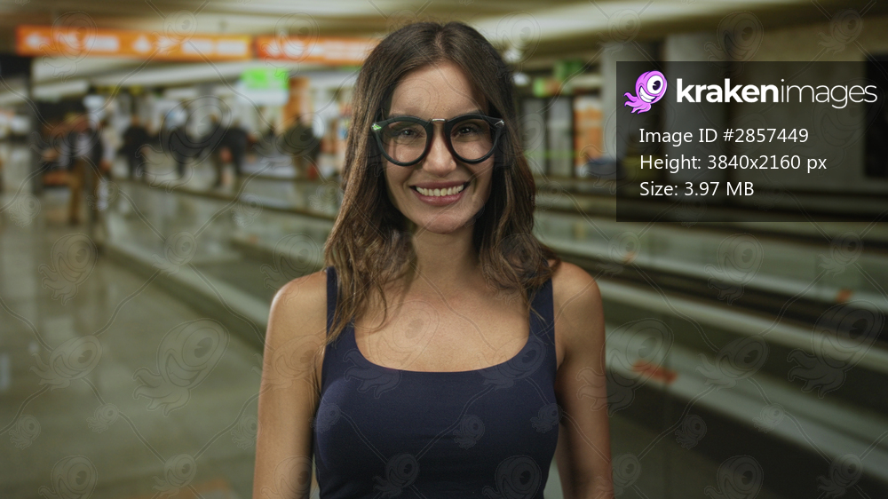 Young hispanic woman with glasses in a sleeveless tanktop points finger upward in busy airport terminal concourse amid moving walkway and passengers; confidence. - Kraken Images