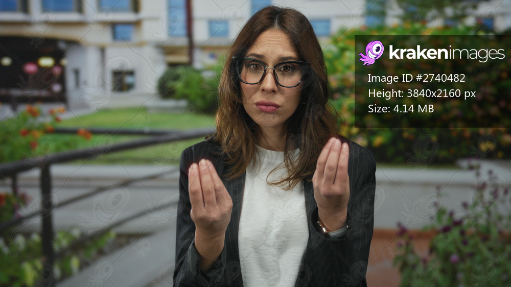 Young hispanic woman with glasses in city street expressing emotion outdoors wearing casual outfit beside flowering shrub and urban building.