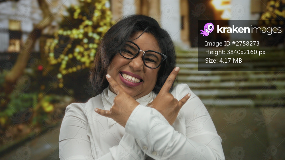 Young hispanic woman with glasses makes rock gesture on city street, expressing joy and confidence outdoors with festive lights in the background.