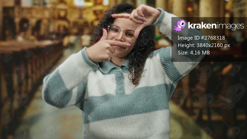 Young hispanic woman with glasses making a framing gesture with fingers inside a church setting with wooden pews and warm lighting in the background.