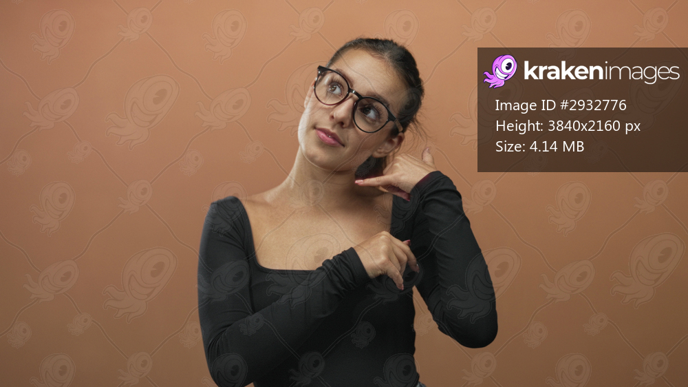 Young hispanic woman with glasses pointing fingers and making a call gesture in peach studio; contemplation.