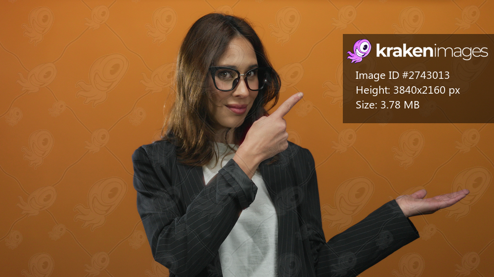 Young hispanic woman with glasses pointing and presenting against an isolated orange background wearing a blazer and white shirt, exuding confidence and professionalism. - Kraken Images