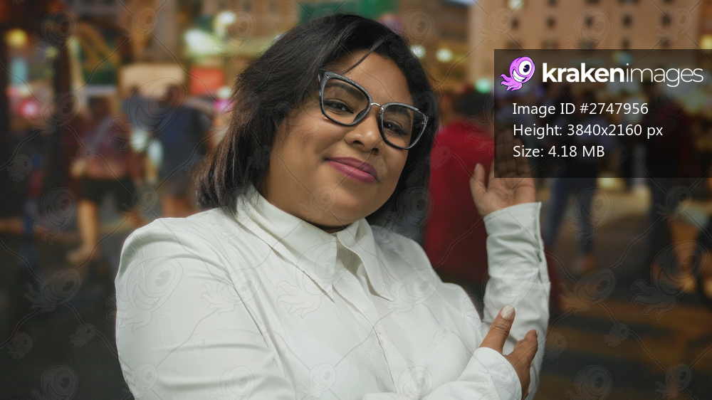 Young hispanic woman with glasses and white shirt gestures on a bustling city street at night, capturing the vibrant energy of an urban environment with a defocused crowd. - Kraken Images