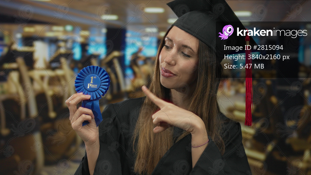 Young hispanic woman graduate wearing mortarboard and gown holds a blue first place ribbon inside gym building while smiling at camera; achievement pride. - Kraken Images