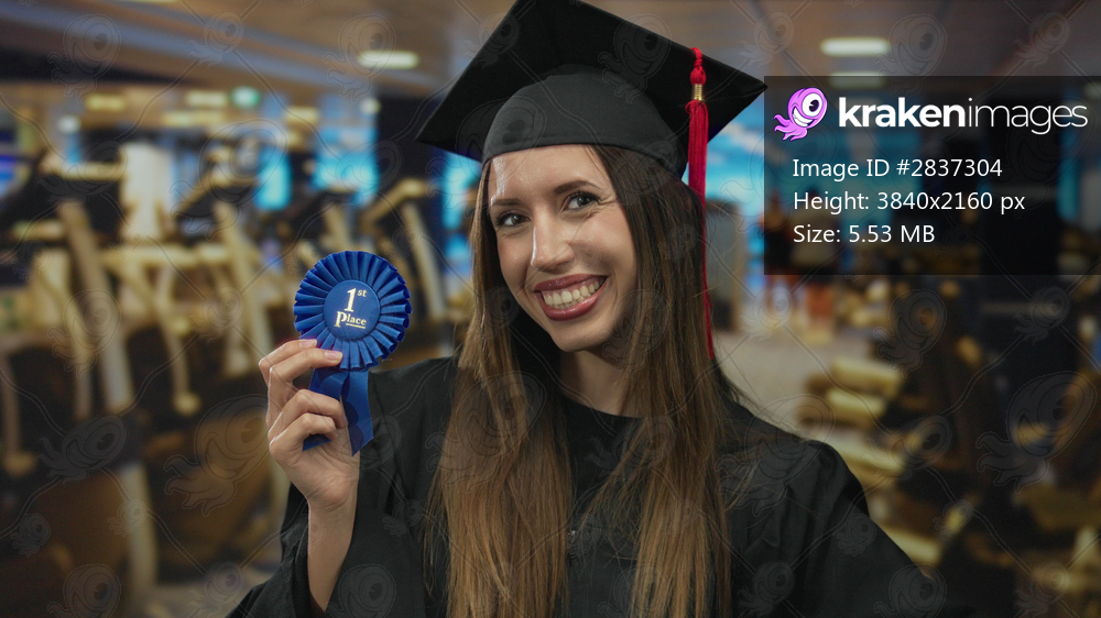 Young hispanic woman graduate wearing mortarboard and gown holds a blue first place ribbon inside gym building while smiling at camera; achievement pride. - Kraken Images